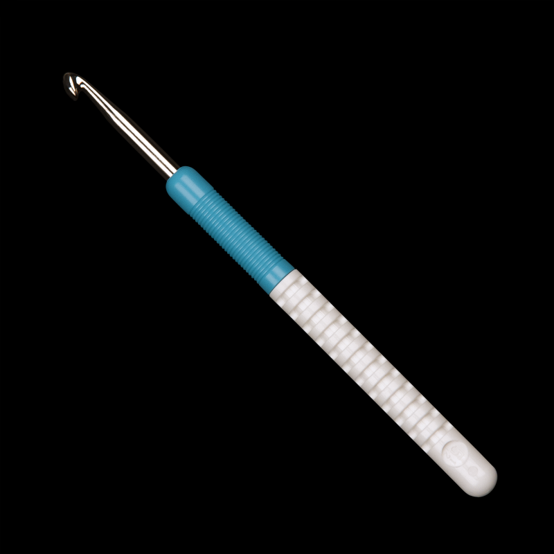 Verstärkter Kunststoffgriff mit vernickeltem Aluminiumhaken, der den richtigen Dreh beim Häkeln erleichtert. Das Vorderteil ist drehbar. So kann die richtige Häkelposition selber ausgewählt werden.