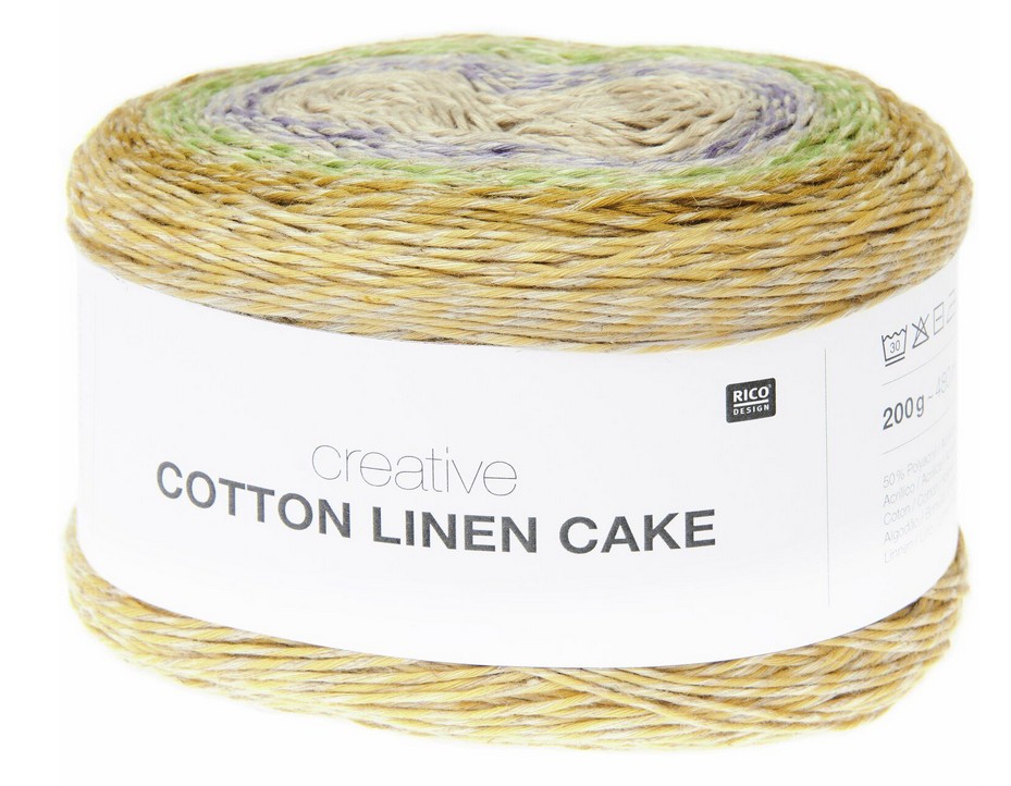 Creative Cotton Linen Cake besteht aus Polyacryl, Baumwolle und Leinen. Die Materialmischung vereint Formstabilität und Pflegeleichtigkeit mit einer natürlichen Haptik. Die Faserstruktur sorgt für eine gleichmäßige Maschenbildung. Der Leinenfaden ist nicht eingefärbt und wird mit einem Farbverlaufsgarn verzwirnt, wodurch ein Melange-Effekt entsteht. Als Kuchenknäuel zeigt das Garn einen besonderen Farbverlauf, der sich über die gesamte Breite des Knäuels erstreckt.