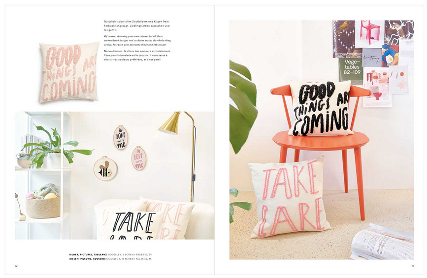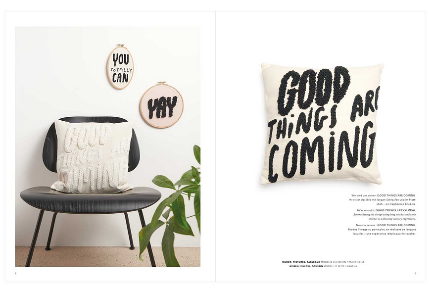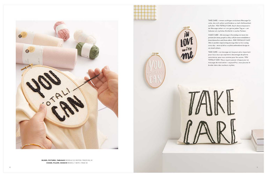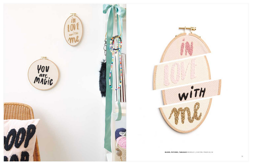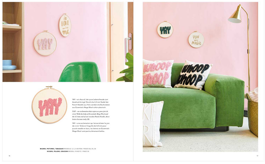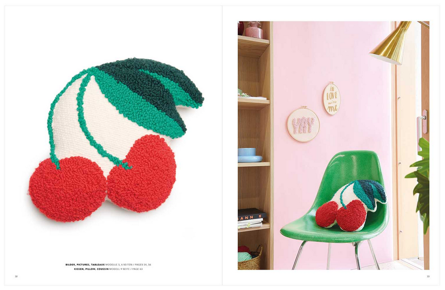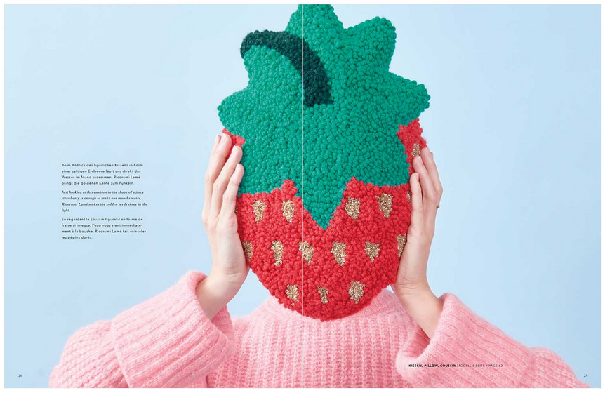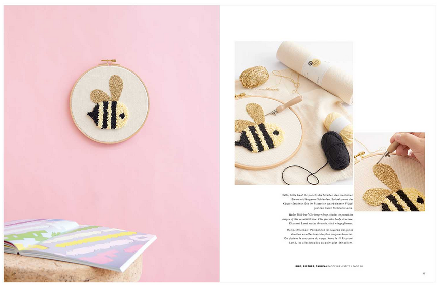 Das Punch Needle Buch „Just Bees + Fruits + Flowers“ umfasst 11 Designs mit unterschiedlichen Schriftzügen mit positiven Bootschaften, Kirschen, fruchtigen Erdbeeren und süßen Bienen. Gepuncht wird mit einer Punch Needle aus Holz sowie dem Garn Essentials Mega Wool chunky. Das Ricorumi Lamé Garn sorgt zusätzlich für glitzernde Effekte.
