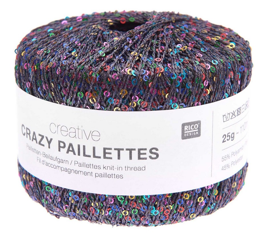 Creative Crazy Paillettes zaubert aus jedem Garn ein Paillettengarn. Einfach das funkelnde Beilaufgarn beim Stricken mitlaufen lassen und schon bekommen die Strickstücke einen glitzernden Effekt in funkelnden Regenbogenfarben. Es gibt ein Anthrazit für dunkle Farben und ein Puder für alle hellen Töne.